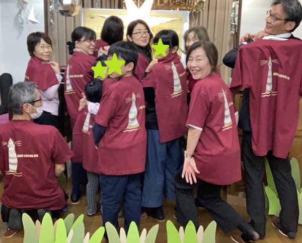 背中に、道を照らす灯台と「Jesus Loves Me」がデザインされています